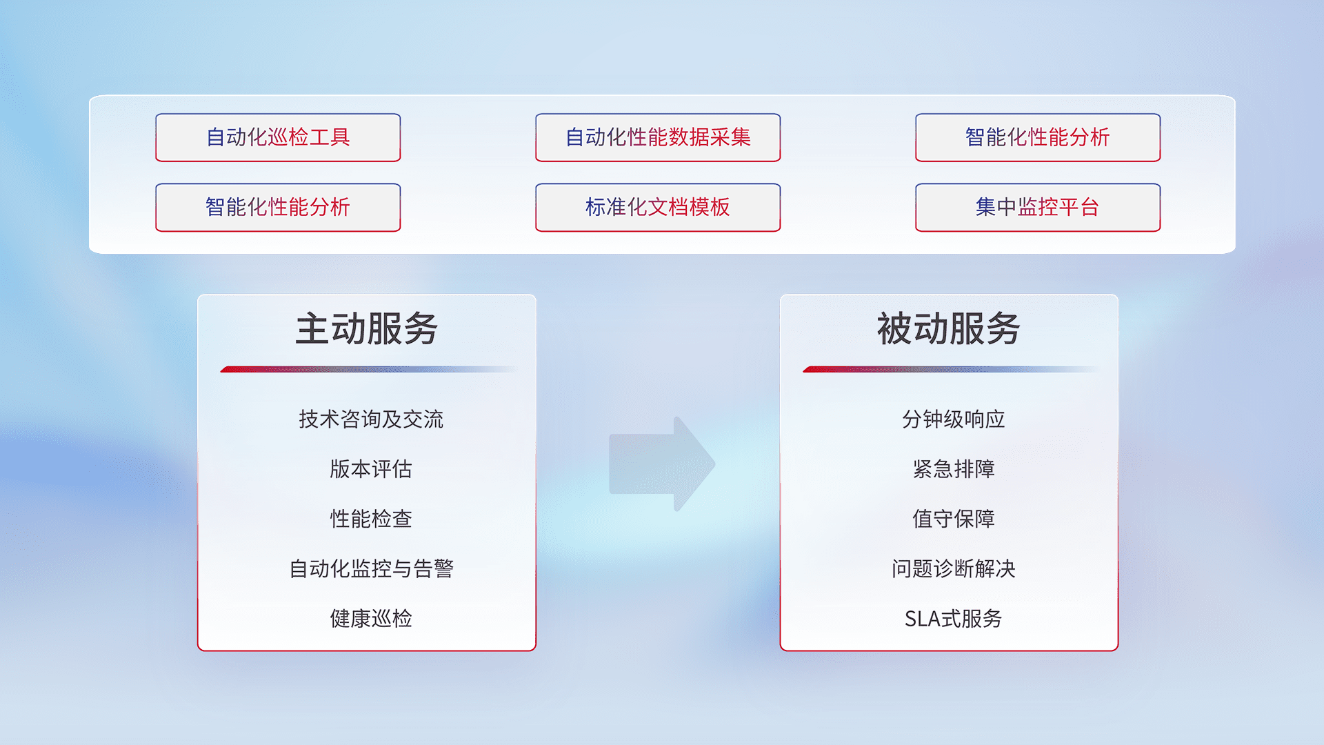 智能化工具和标准化文档,,,保障服务质量,,,提供主动服务(包含技术咨询、、、版本评估、、性能检查、、自动化监控与告警、、、、健康巡检)和被动服务包含(分钟级响应、、、、紧急排障、、、、值守保障、、问题诊断解决、、、、SLA服务)。。